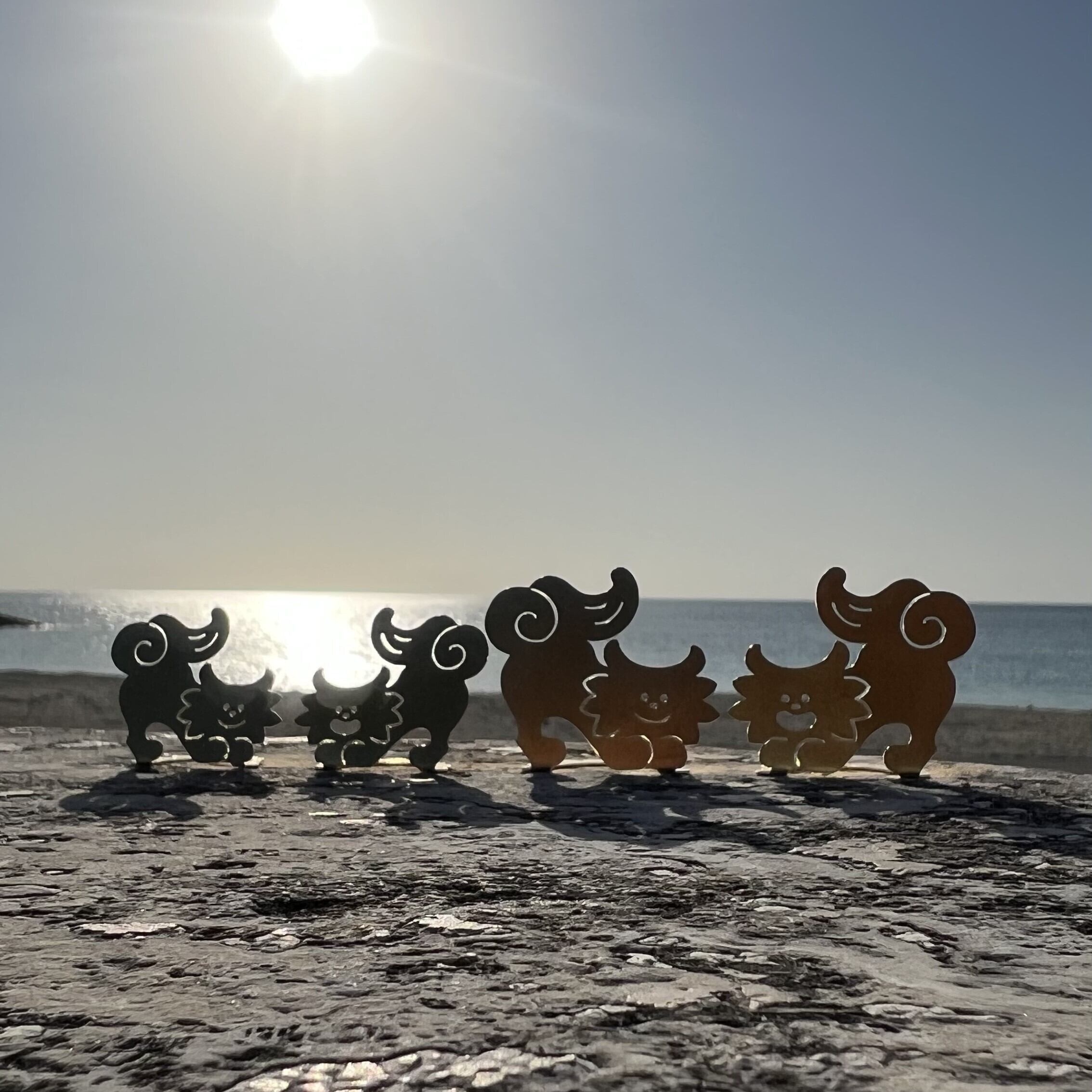 やちむん(焼き物)のシーサーとはまた違った趣きのある金属製シーサー。とにかく薄くて軽いのでお土産として、贈り物として、邪魔にならず生活空間に溶け込めます。落下しても破損しませんのでほんのちょっとした窓枠などにも置けるのがおすすめポイントです。お手持ちのコースターや木片の上に置いても♪
